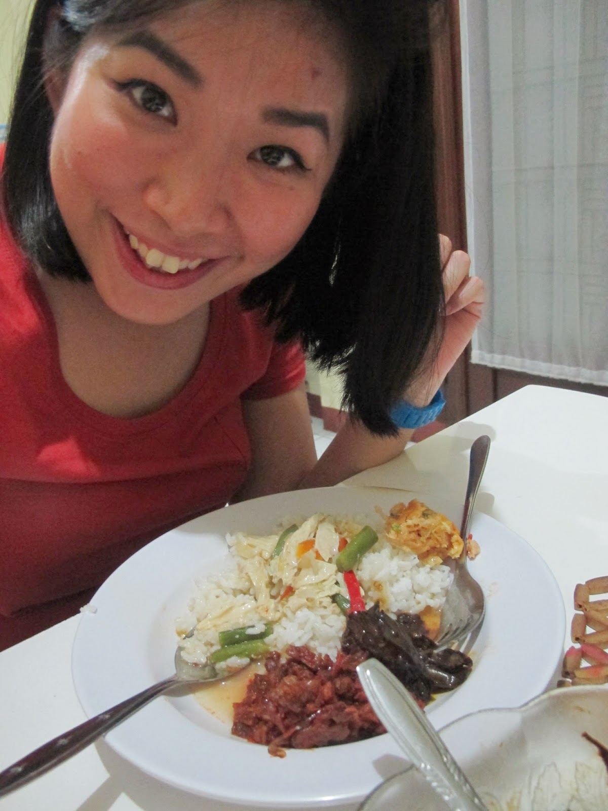 But anyway, everyone addresses an older lady by ibu and an older man by pak. So the free meal cooked by ibu was tempeh sambal (spicy fermented soybean), sayur masak lemak (vege cooked w coconut milk), terung kicap (dark soy sauce brinjal) and some steam egg kinda dish.